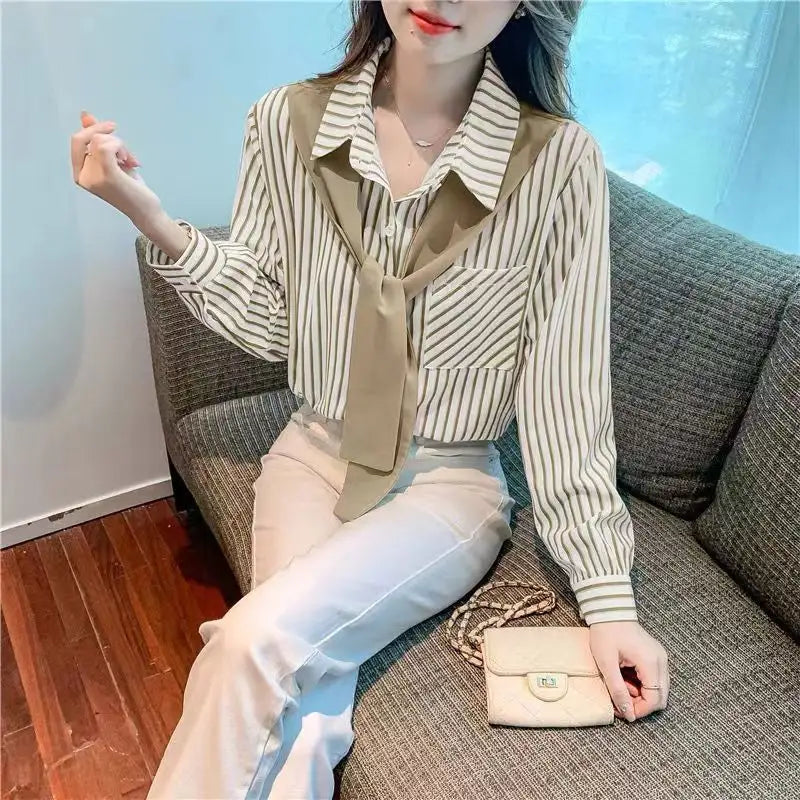 Green shawl striped shirt Women's loose fitting long sleeve Top