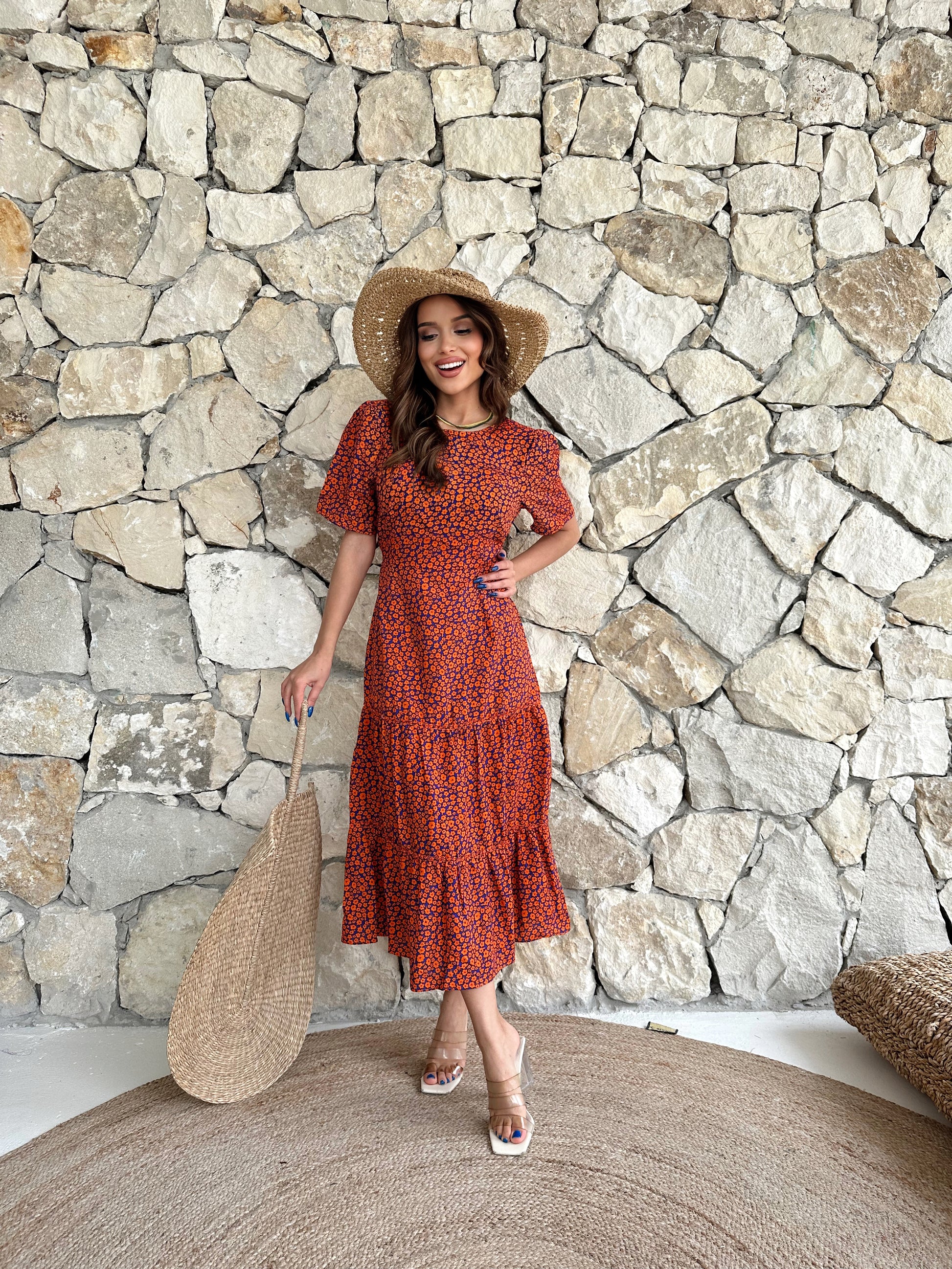 CRO10334 - Long Crispy Pattern Dress - Orange